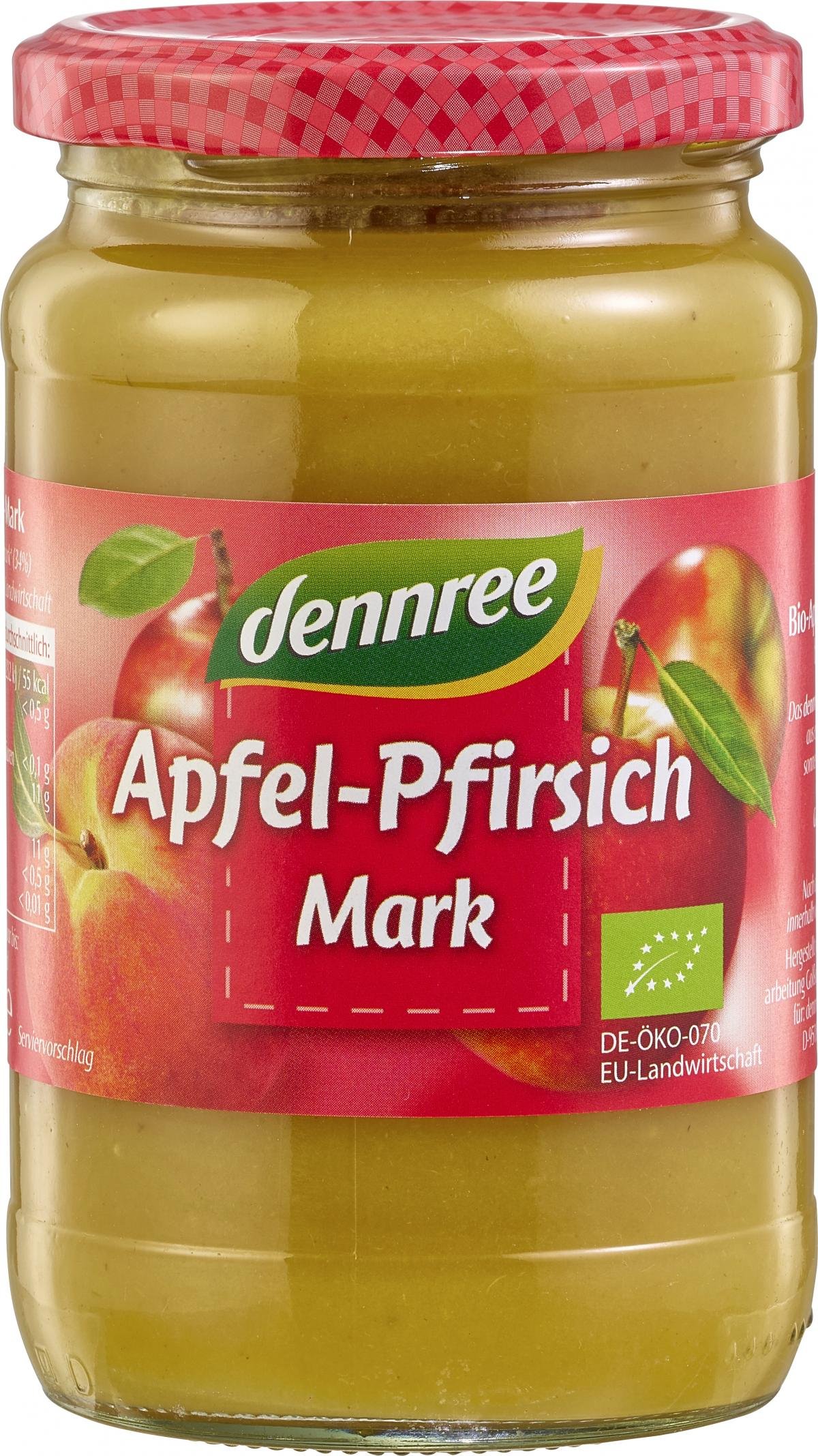 Bio-Apfel-Pfirsich-Mark bietet reinen Genuss. Das dennree Apfel-Pfirsich-Mark wird aus erntefrischen Bio-Äpfeln und sonnenverwöhnten Bio-Pfirsichen schonend hergestellt. Genießen Sie den fruchtig-feinen Geschmack.