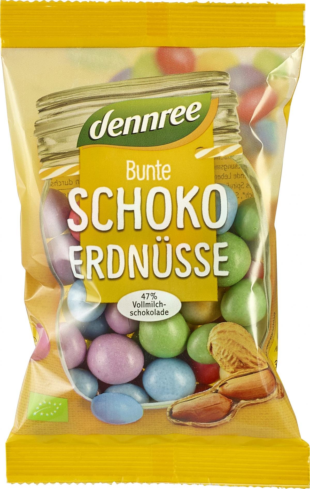 Bunte Bio-Schoko-Erdnüsse bieten reinen Genuss. Für die dennree Schoko-Erdnüsse werden knackige Erdnüsse mit feiner Vollmilchschokolade umhüllt und mit bunter Zuckerglasur überzogen. Genießen Sie den nussig-schokoladigen Geschmack.