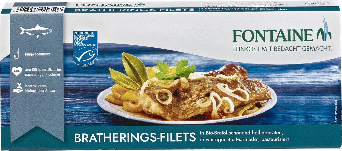 Für den Atlantischen Hering ist der Norden des FAO Fanggebiets 27 ein idealer Lebensraum. Die dort praktizierte Fischerei mit Ringwadennetzen und pelagischen Schleppnetzen ist vom Marine Stewardship Council (MSC™) als nachhaltig anerkannt. Fontaine Heringsprodukte zeichnen sich durch eine verantwortungsvolle Verarbeitung und Verfeinerung mit besten Bio-Zutaten aus.