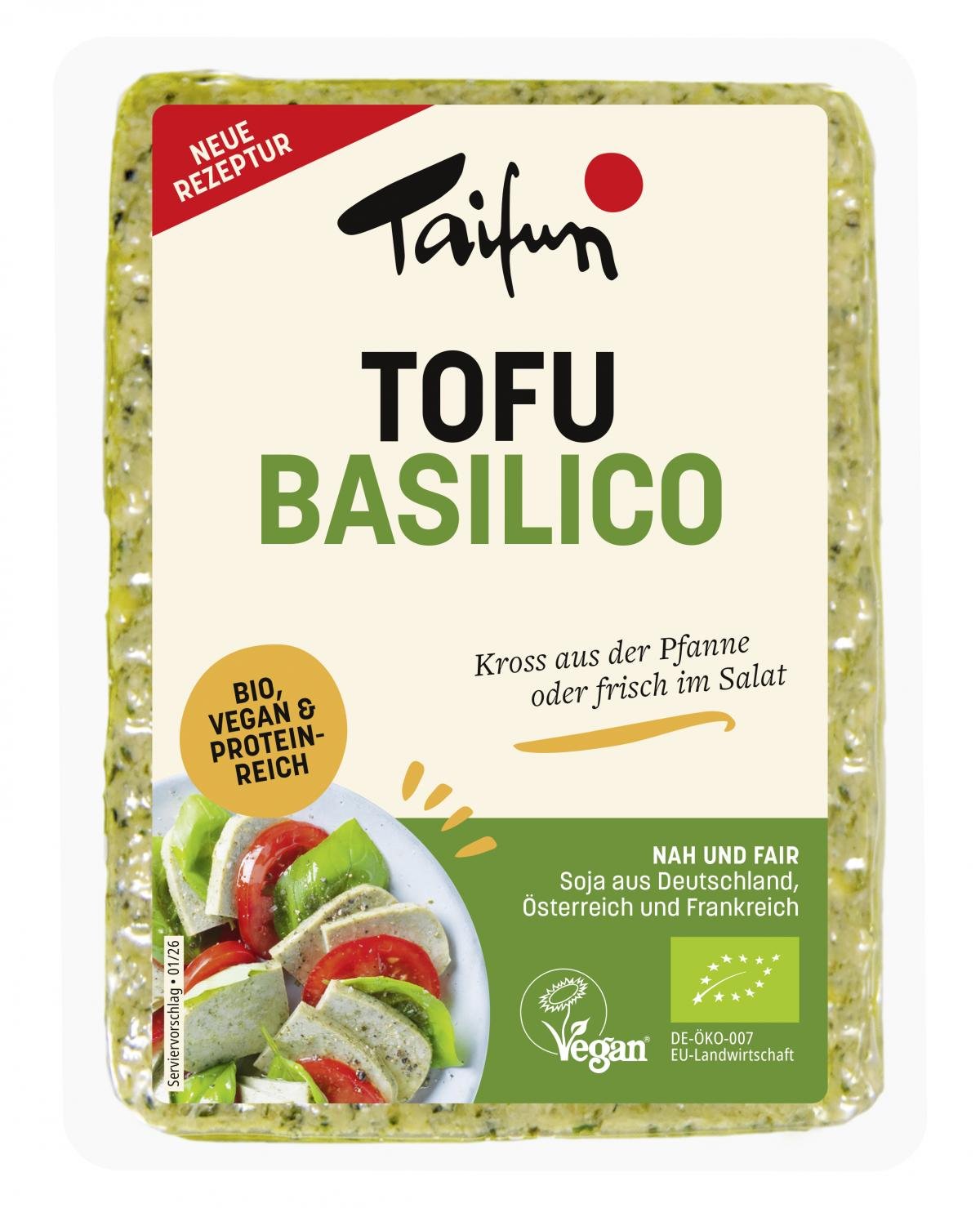 Der Tofu Basilico von Taifun steckt voller frischer Kräuter und überzeugt mit seiner angenehmen Konsistenz. Die feine Basilikumnote setzt Akzente sowohl in der kalten als auch in der warmen mediterranen Küche.