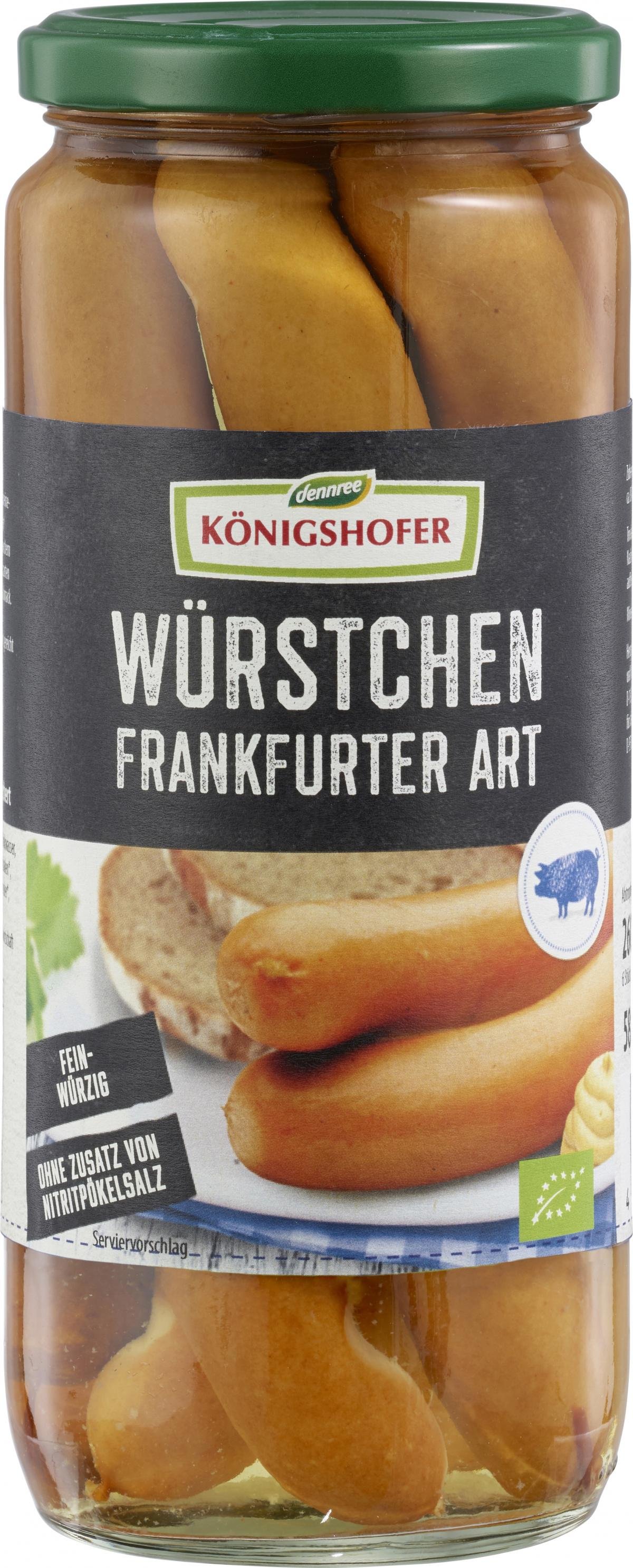 Für die Königshofer Würstchen nach Frankfurter Art wird bestes Bio-Schweinefleisch zusammen mit ausgewählten Gewürzen verarbeitet. Durch das Räuchern über Buchenholzrauch erhalten die zarten Würstchen ihren fein-würzigen Geschmack. Sie sind warm oder kalt ein Genuss. Dazu kann ein kräftiges Vollkornbrot gereicht werden.
