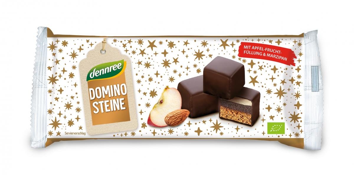 Die Dominosteine sind mit einer aromatischen Apfelfruchtfüllung und feinem Marzipan hergestellt und mit Zartbitterschokolade überzogen.