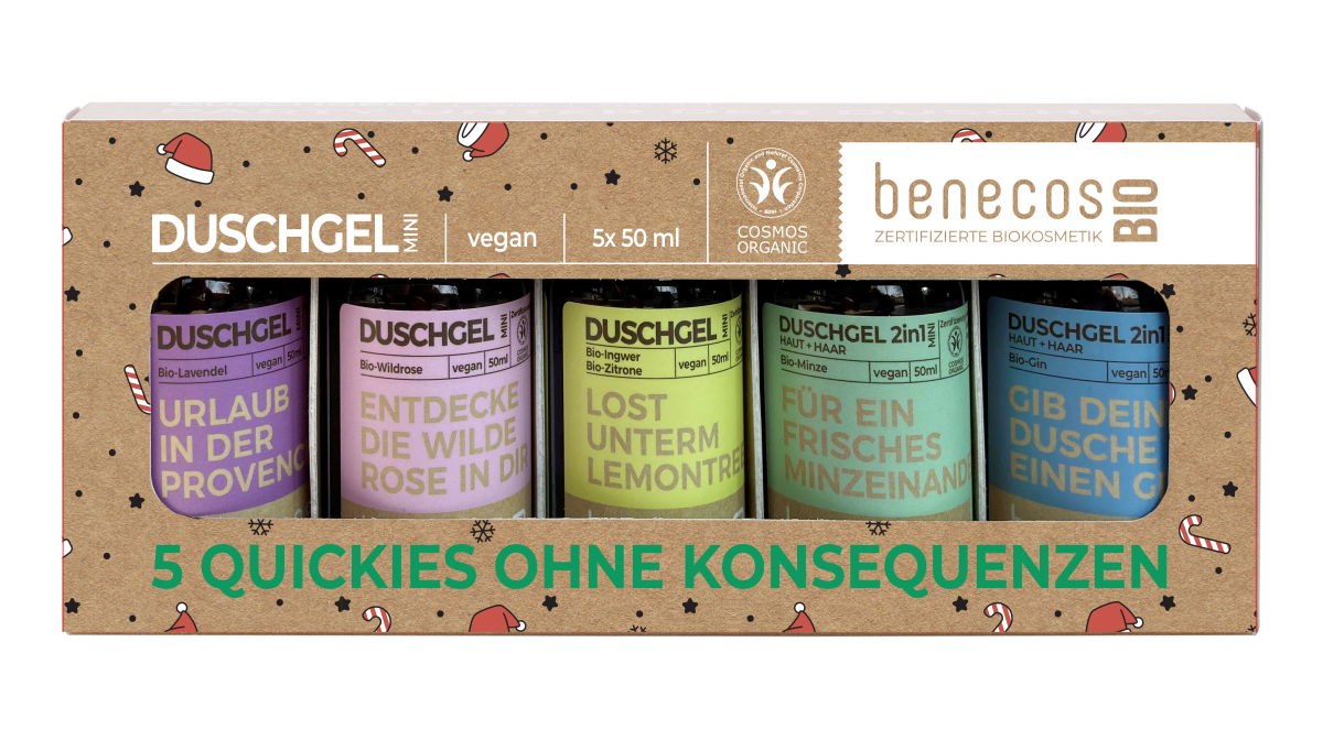 Fünf ausgewählte benecosBIO Mini-Duschgele. Dermatologisch getestet, mit BIO-Apfelsaft und pflanzlichen Tensiden.