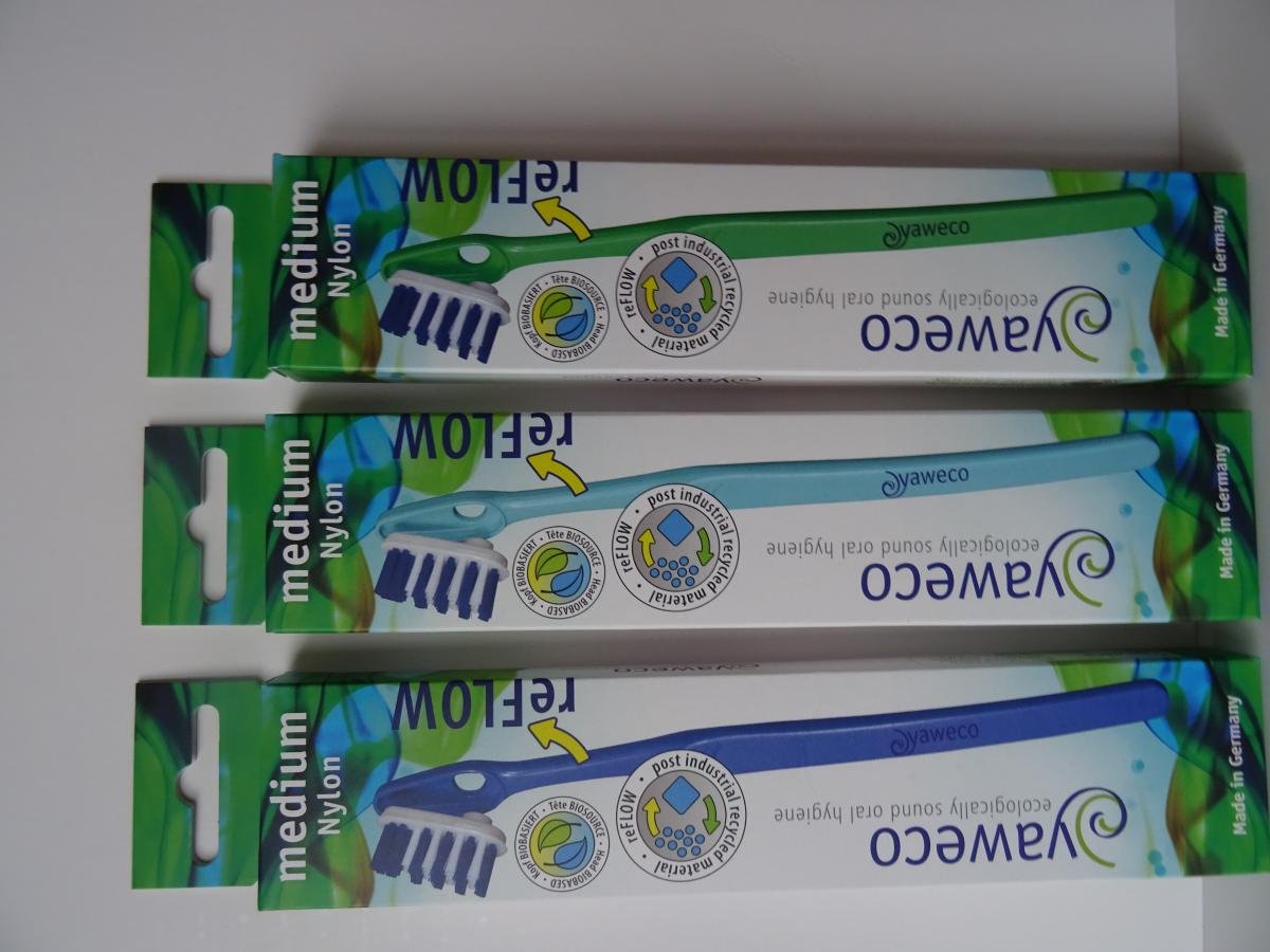 Wechselkopfzahnbürste reFLOW medium: Nachhaltige Zahnbürste mit Wechselkopf medium, aus post industriellem Rezyklat: Ausschussmaterial aus anderen Produktionen wird gemahlen und für die Produktion der reFLOW verwendet. Kopf aus biologisch abbaubaren Materialien mit Borsten mit Rizinsöl statt Rohöl.