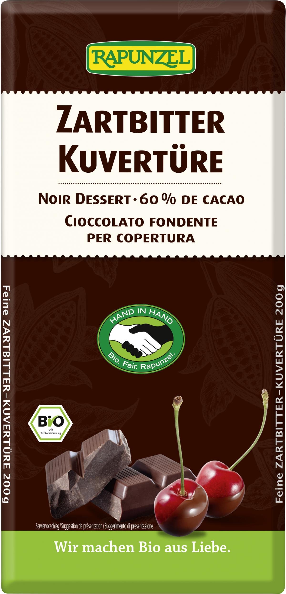 Was wären zarte Pralinen, süße Früchte oder feines Gebäck ohne diesen schmelzenden Überzug aus glänzender Schokolade? Der hohe Anteil an aromatischem, feinherbem Kakao mit einem Hauch Bourbon Vanille verfeinert Ihre Kuchen, Gebäcke und Pralinen. Die Kuvertüre wird aus fair gehandeltem Kakao und Zucker hergestellt und ist ein Produkt des Rapunzel HAND IN HAND-Sortiments.