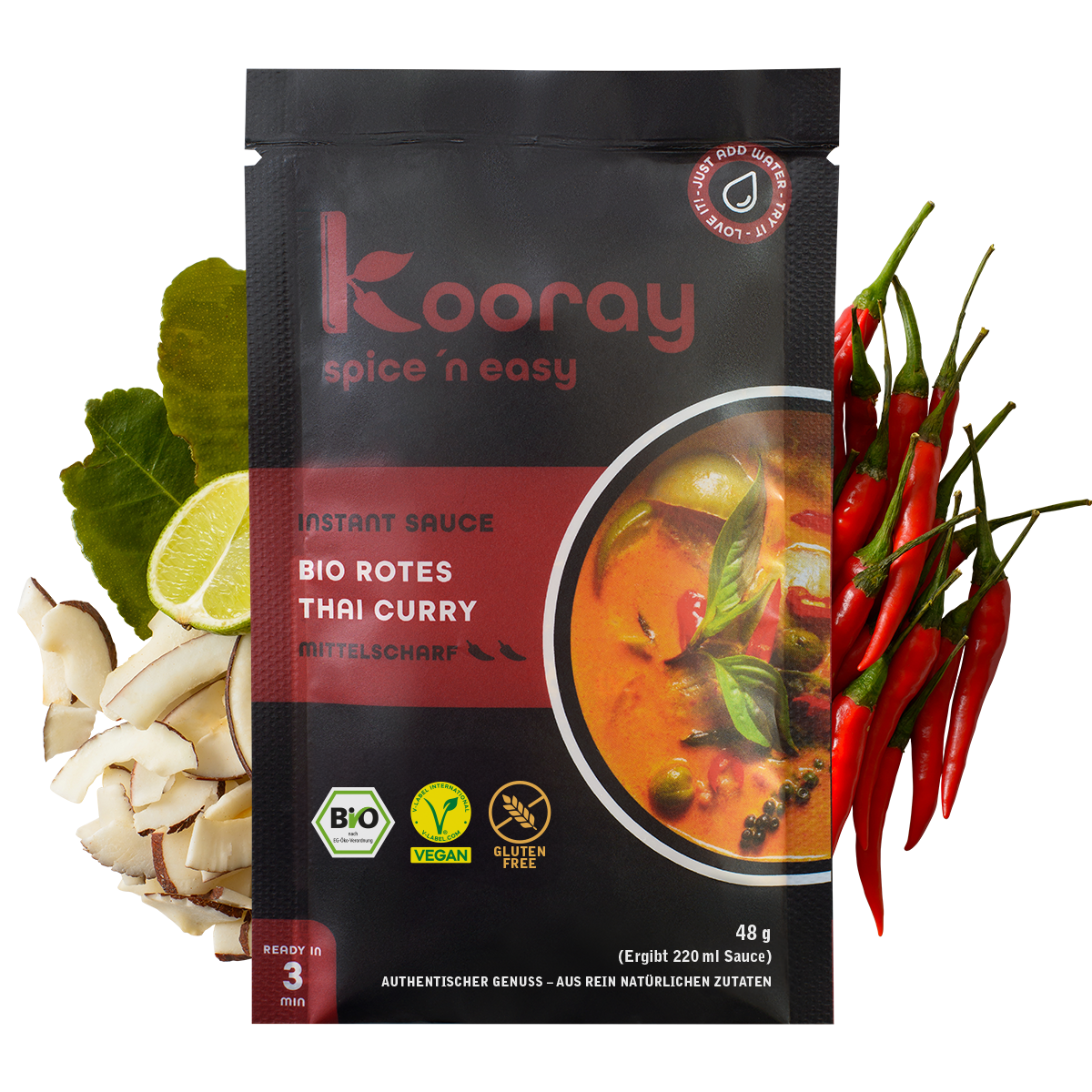 Kokosmilchpulver* (Kokosmilch*, Maltodextrin*), Zucker*, Curry Paste* (Chili* 13%, Schalotten*, Zitronengras*, Knoblauch*, Koriandersamen*, Galgant*, Kaffirlimette* 5%, Kreuzkümmel*, Paprika Edelsüß*), Maisquellstärke*, Meersalz