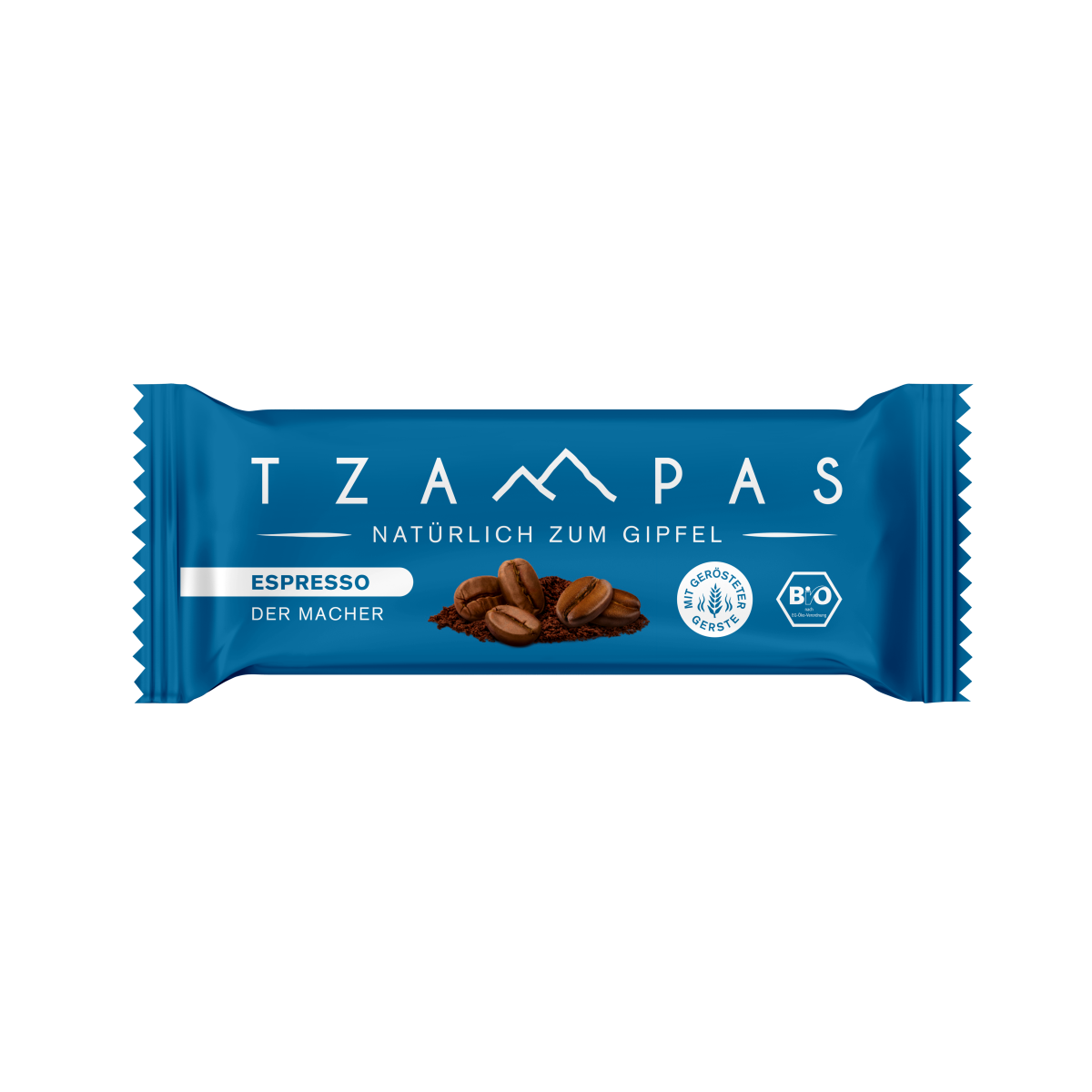 Kaffeefreunde aufgepasst! Hier kommt der TZAMPAS Espresso Riegel mit seiner unvergleichlichen Kombination aus nussig-mildem Gerstenmehl und kräftigen Kaffeebohnen.