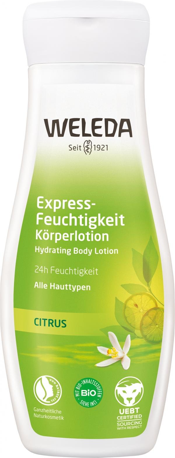 Die Express-Feuchtigkeit Körperlotion von Weleda spendet sofortige Erfrischung und langanhaltende Feuchtigkeit – für ein weiches, angenehmes Hautgefühl.
